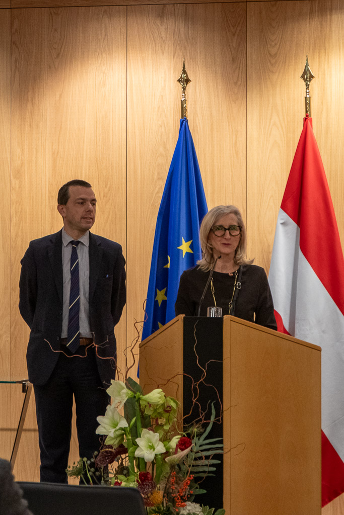 Die Veranstaltung letzten Donnerstag stand ganz im Zeichen der deutsch-französischen Freundschaft und Zusammenarbeit. Getrud Aichem-Degreif, Kulturreferentin der Deutschen Botschaft, und Bruno Ducluzaux, Leiter des Institut français d’Autriche, begrüßten die Gäste in den erst letzten Oktober eröffneten neuen Räumlichkeiten der deutschen Botschaft Wien. Wie die beiden betonten wurde gestern vor 63 Jahren der Élysée-Vertrag unterzeichnet, der die Freundschaft zwischen Deutschland und Frankreich besiegeln sollte und die mit dieser Abendveranstaltung gefeiert wurde.