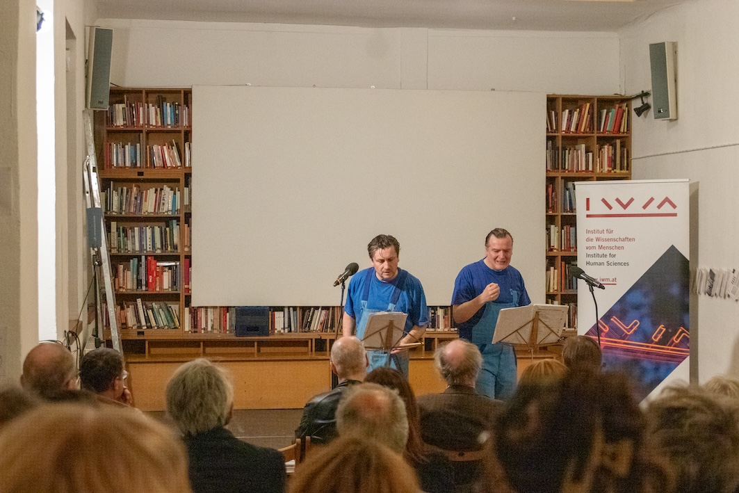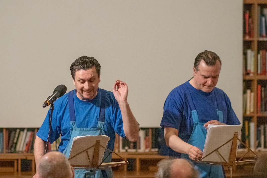 Im zweiten Teil des Abends gehörte die Bühne Pavel Novotný, Jaromír Typlt und ihrer Performance von Kurt Schwitters »Ursonate«. Diese ist ein Lautgedicht, komponiert in den Sätzen einer Sonate, und gilt als eines der bedeutendsten dadaistischen Werke. Novotný und Typlt, die aus dem Lautgedicht ein Stück für zwei Stimmen entwickelt haben und seit 20 Jahren damit herumtouren, traten im Rahmen des Vienna Meets Prague-Festivals erstmals in Wien auf.